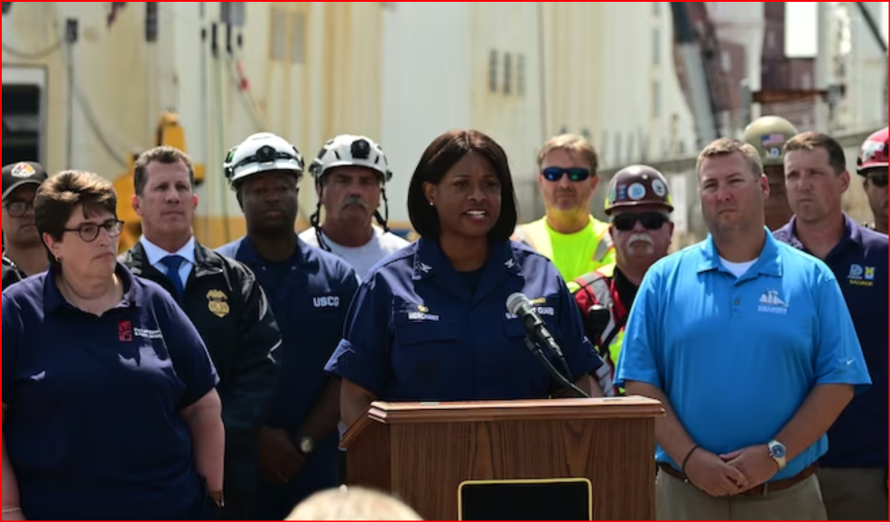 TOP - U.S. Coast Guard Capt. Zeita Merchant, the captain of the port and federal on-scene coordinator, addresses the media during a press conference in front of the motor vessel Grande Costa D’Avorio in Port Newark, New Jersey, July 11, 2023.