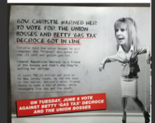 Cesaro wants the seat currently occupied by DeCroce, who voted in favor of the Christie-championed gas tax deal in order to replenish the depleted state Transportation Trust Fund (TTF). The mail piece his campaign unleashed on her features DeCroce done up like a marionette and complying with the union bosses and Christie's directives.