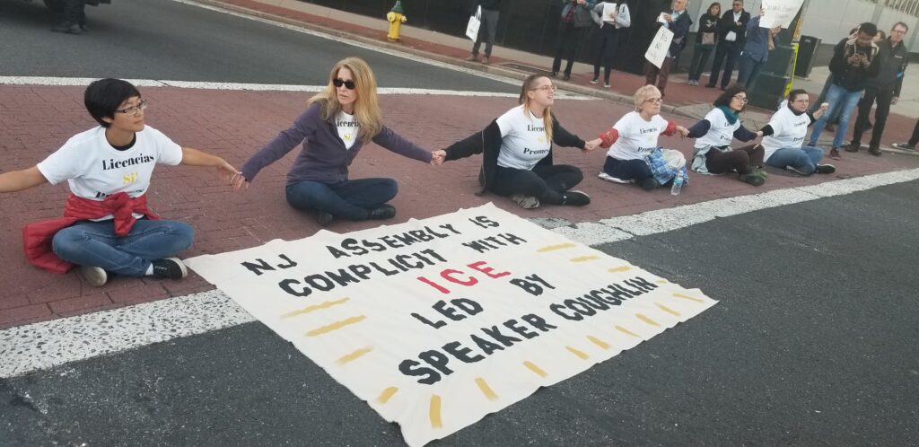 led protestors to march peacefully and participate in civil disobedience beginning at 20 Ferry Street at Peter Francisco Park at 4 PM today, demanding that New Jersey lawmakers pass A4743, which would make residents eligible for driver licenses regardless of immigration status.