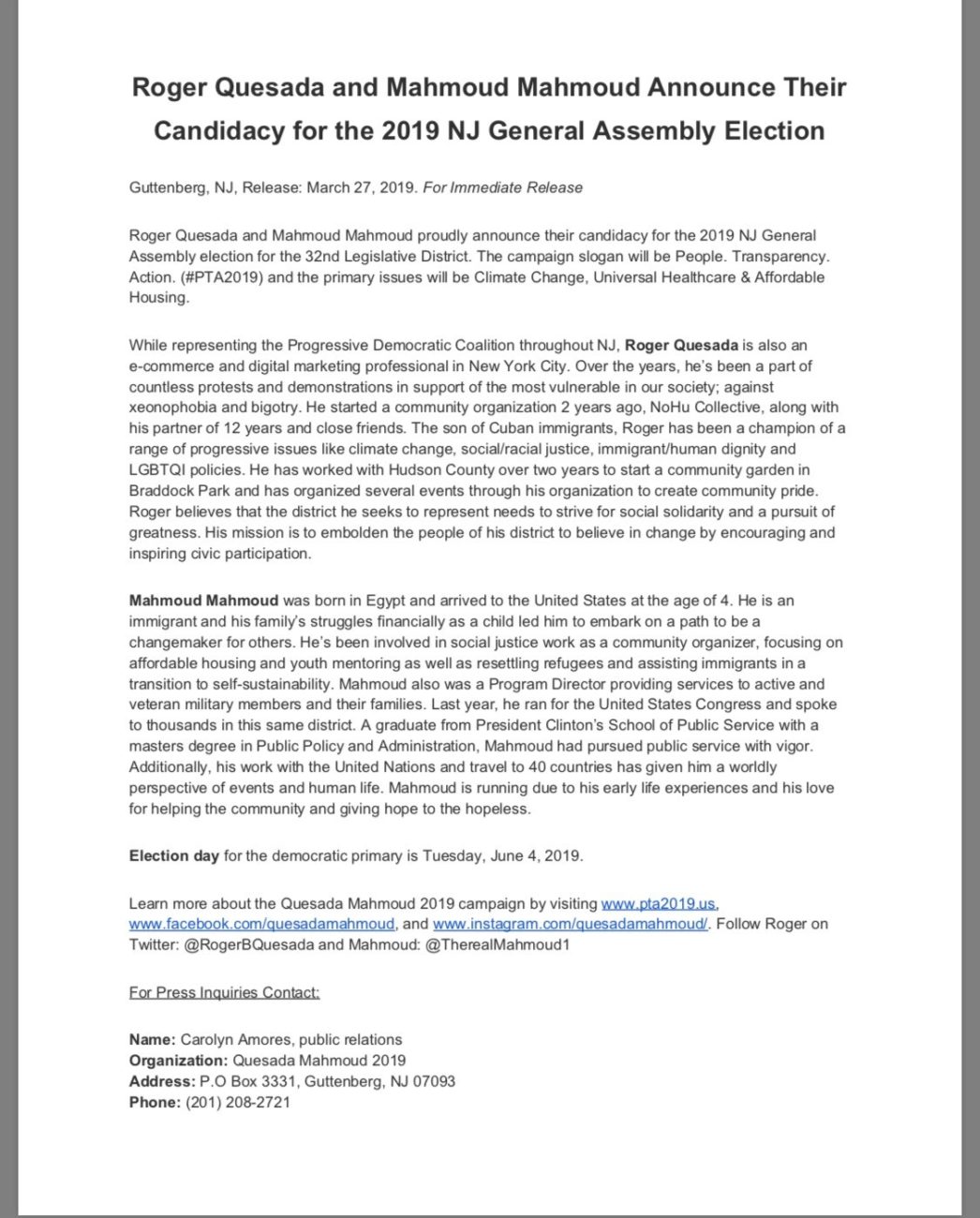 Roger Quesada & Mahmoud Mahmoud Announce LD32 2019 NJ Assembly Race