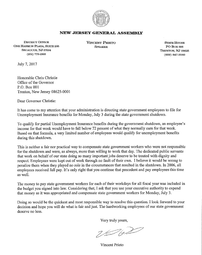 As the Senate is poised to hold a voting session next Thursday, Speaker Prieto delivered a letter Friday to Gov. Chris Christie as part of his effort to get immediate help for state workers following the state government shutdown. Yesterday, the Department of Labor's website gave a notice to state workers who were out of work due to the shutdown directing them to file for unemployment.