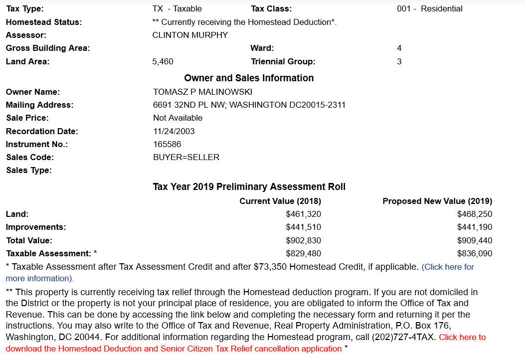 As noted in a Roll Call article, Malinowski owns a home in the Chevy Chase section of Washington, D.C, and collects a homestead deduction, which indicates that he considers the home his primary residence (see below).