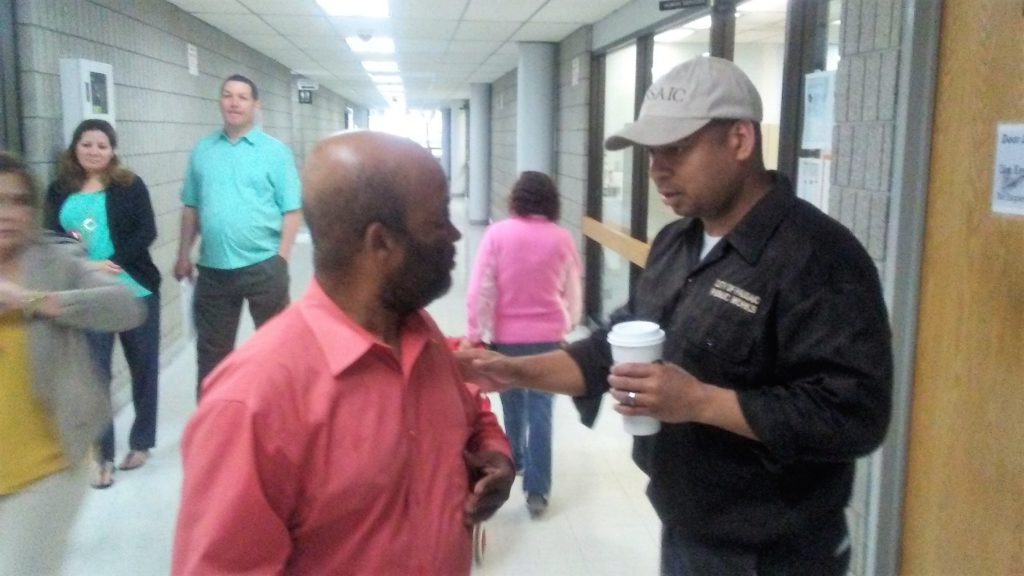 When he rounded the tiled corner, the man found his shoulder supported by the mayor, who greeted him in Spanish, helping to hold him upright as he listened intently to the complaint or ache or groan that he met with respectful intensity, even as the human services cubicle at his back swelled with people, one of them a baby crying.