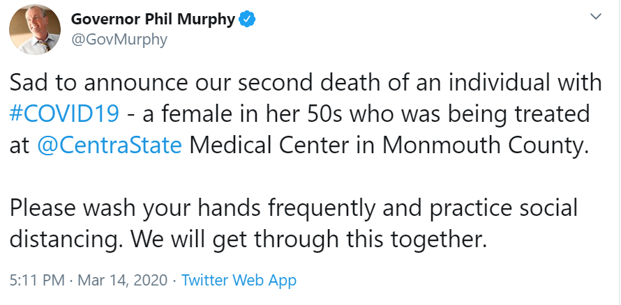 "Sad to announce our second death of an individual with #COVID19 - a female in her 50s who was being treated at @CentraState Medical Center in Monmouth County.