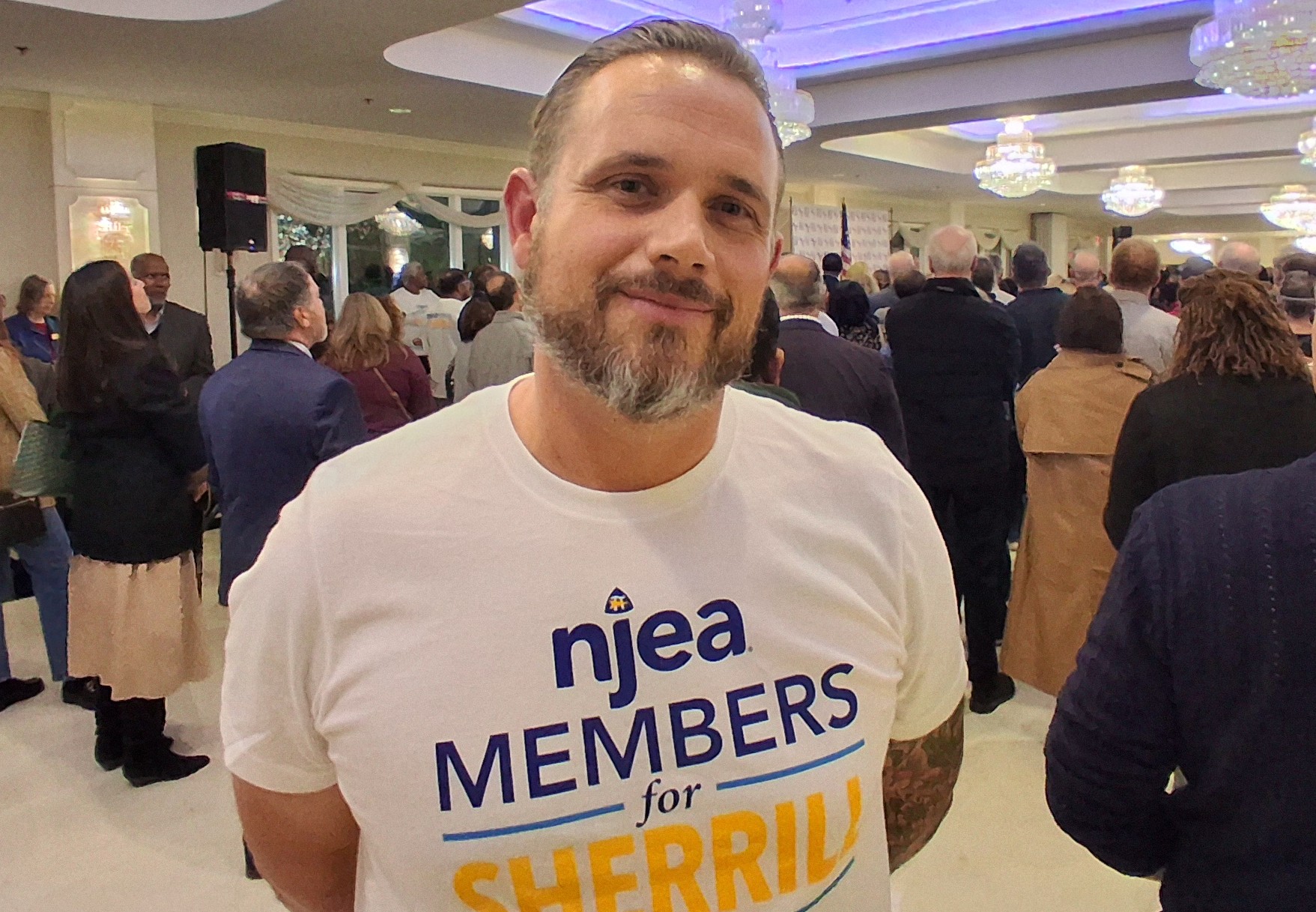 At the microphone in the front of the crowd, Goodhue represented Steve Beatty, president of the NJEA.