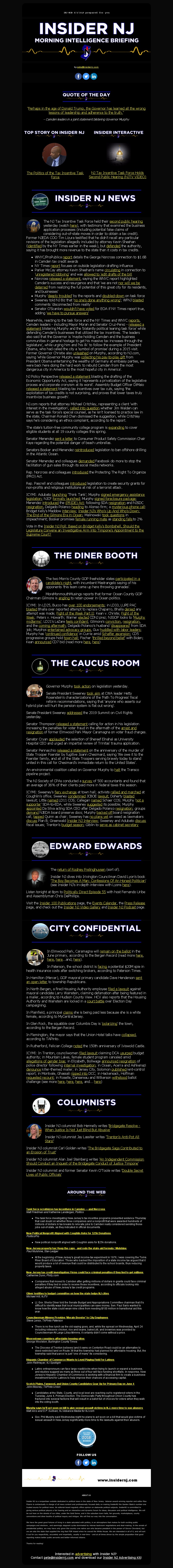 Sign up for the Insider NJ Morning Intelligence Briefing! By Insider NJ | May 4, 2019, 3:30 pm | in News Email *First *Last *Select list(s) to subscribe toMIB SUBSCRIBERS Example: Yes, I would like to receive emails from Insider NJ. (You can unsubscribe anytime)Constant Contact Use. Please leave this field blank. Article Tags: Insider NJ Morning Intelligence Briefing Click here for the full Insider Index