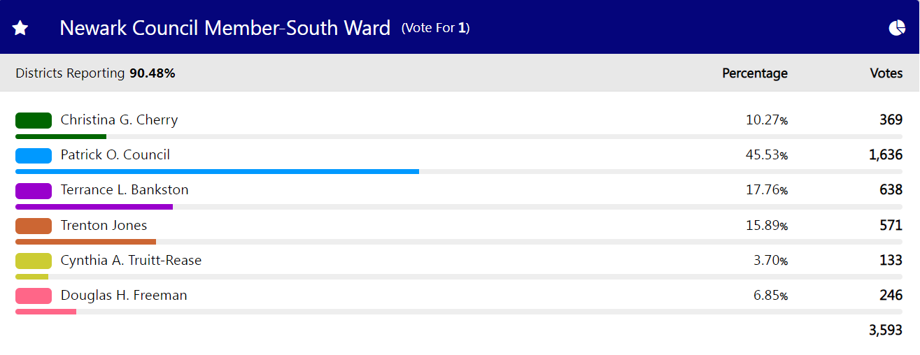 South Ward Heading for a Runoff By Insider NJ | May 10, 2022, 9:58 pm | in The Diner Booth Newark South Ward candidate Pat Council appears to be heading for a runoff with Terrance Bankston.