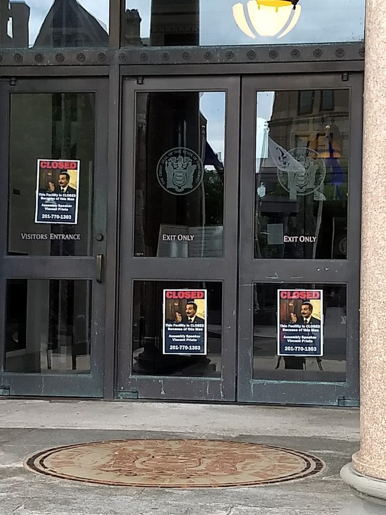 Allies of Speaker Prieto fired off a letter to Attorney General Porrino demanding the removal of anti-Prieto flyers that were seen on Statehouse doors and other government structures today. The letter, signed by the NJEA, Working Families NJ, and the CWA, specifies that if their legal counsel receives no response from the AG, they will contact the Mercer County Sheriff's Office.