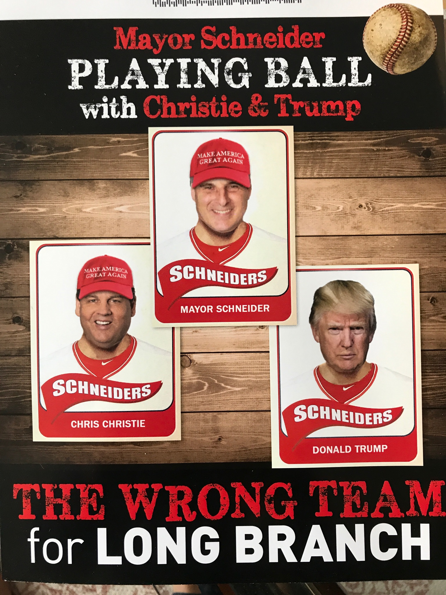Referring to Schneider, a piece designed by Mitch Seim reminded voters of the incumbent Mayor's 2013 endorsement of Governor Chris Christie and his championing of a development project owned by Jared Kushner, son-in-law of President Donald J. Trump.