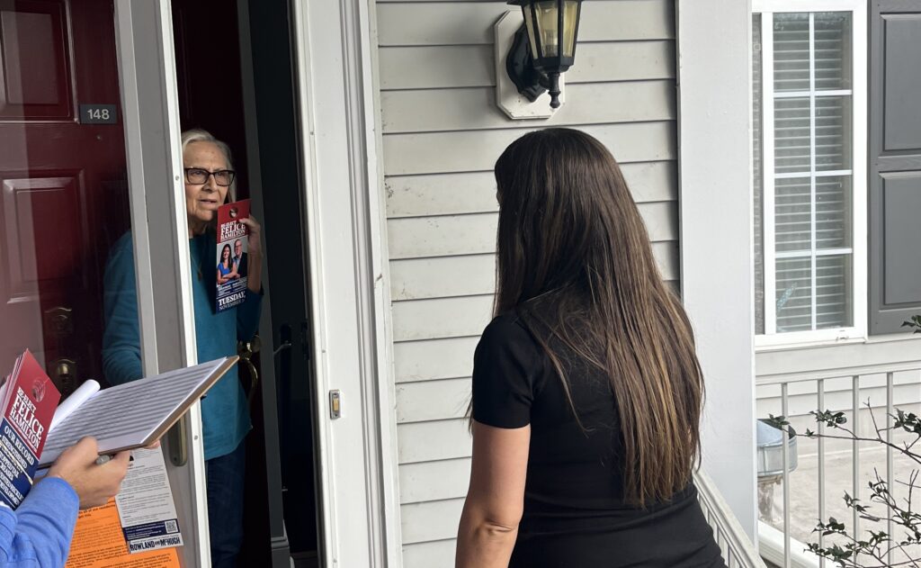 Many of the doors Felice and Musella visited had bright orange literature hanging from the doorknobs in support of Democratic candidates Jennifer Rowland and Marty McHugh. The Republican candidate running with Felice is fellow incumbent Mark Hamilton.
