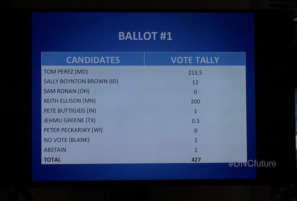 In Atlanta after first ballot voting by the Democratic National Committee, former Labor Secretary Tom Perez had 213.5 votes and U.S. Rep. Keith Ellison had 200 votes.