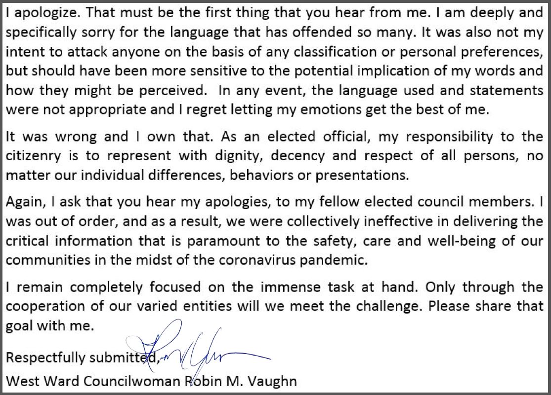 Trenton Councilwoman Robin Vaughn issued an apology tonight over homophobic comments directed at Trenton Mayor Gusciora and Councilman Harrison on a conference call several days ago, first reported by the Trentonian, which was supposed to be about COVID-19 but devolved into a shouting match between the three.
