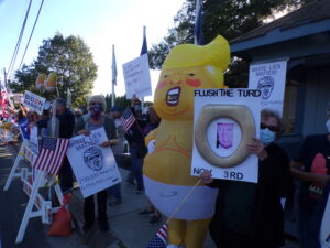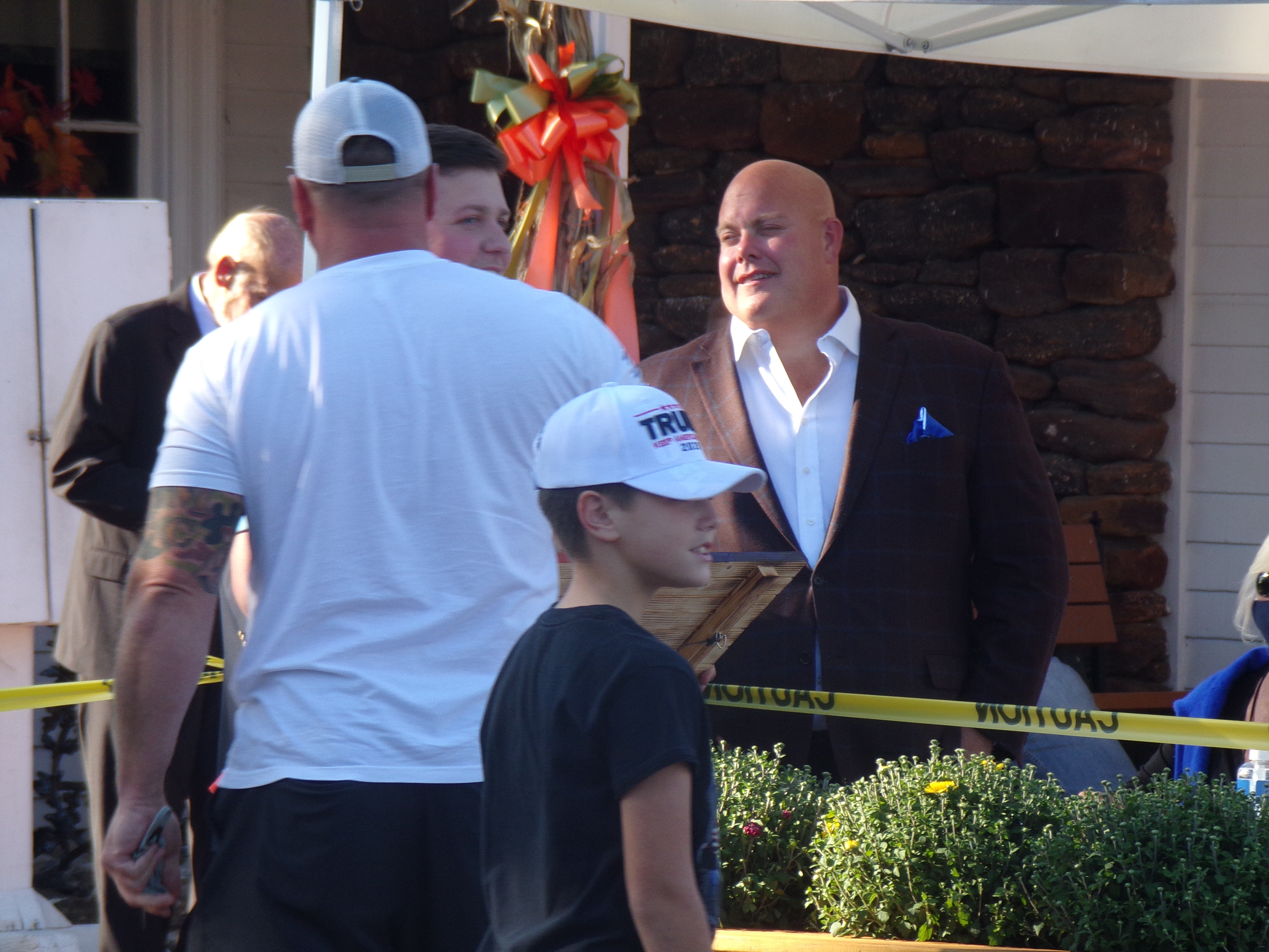 The salt and pepper bearded presence of Donald Trump, Jr. at a fundraiser this evening prompted the backers of his incumbent Republican father and the allies of Democrat Joe Biden to straddle turf outside the event and trade insults, sometimes viciously and pointedly and other times simply peaceably animatedly, with 42 days to go before the Nov. 3rd presidential election.