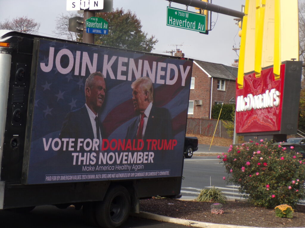 Then the truck turned and backed into a space, and people on the sidewalk looked at the flashing image on the side. It was a big colorful picture of Bobby Kennedy, Jr., standing there with Donald Trump, the Republican nominee for president. “JOIN KENNEDY. Vote for Donald Trump this November.”