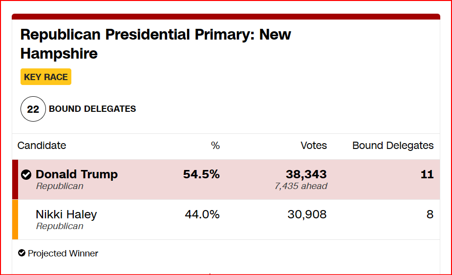 Former President Donald J. Trump defeated former UN Ambassador Nikki Haley tonight in New Hampshire 's Republican Presidential Primary.