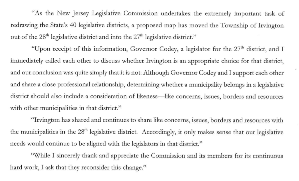 I agree wholeheartedly with Mayor Vauss regarding this issue. Irvington has been a long standing municipality in the 28th district and should remain there based on its success.