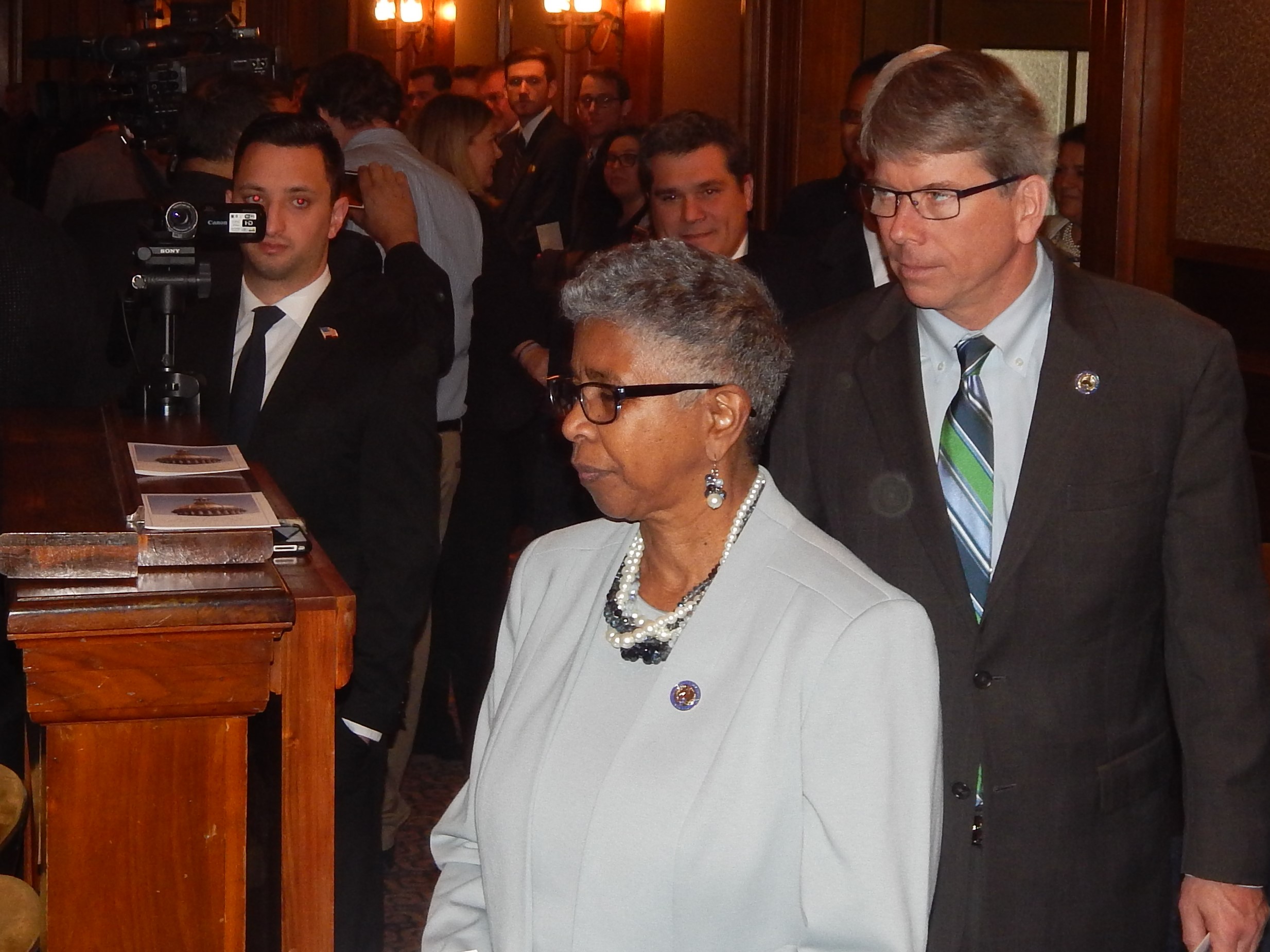 Assemblyman Sean Kean (R-30) and Assemblywoman Cleopatra Tucker (D-28) enter the auditorium behind the fife and drum corps.