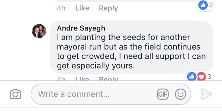 "I am planting the seeds for another mayoral run but as the field continues to get crowded I need all the support I can get especially yours," Sayegh wrote in a Facebook thread.