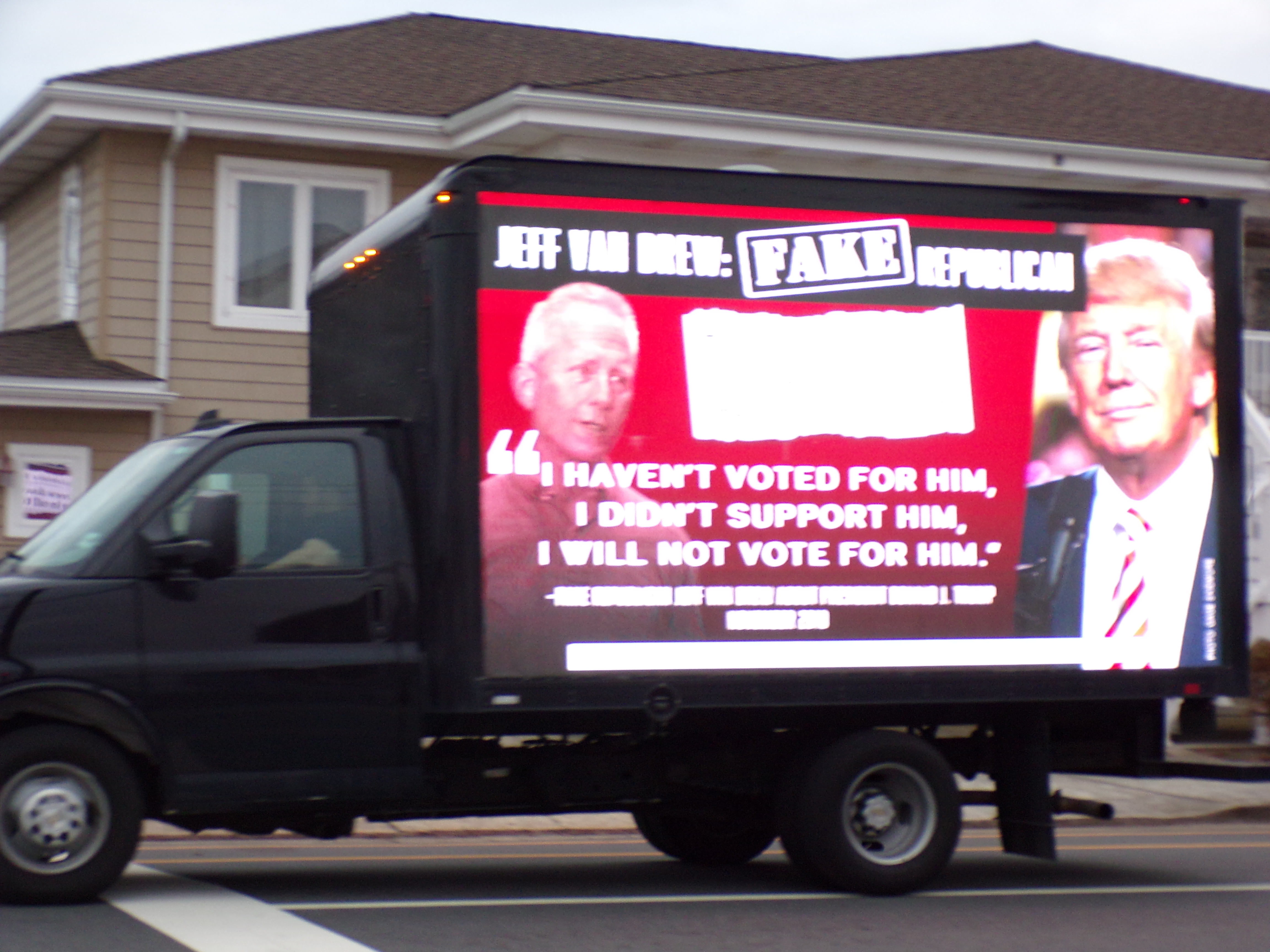 "Jeff Van Drew: Fake Republican," read the bold-typed message, furnishing a choice Van Drew quote from its recent archives: "I haven't voted for him, I didn't suppot him, I will not vote for him."