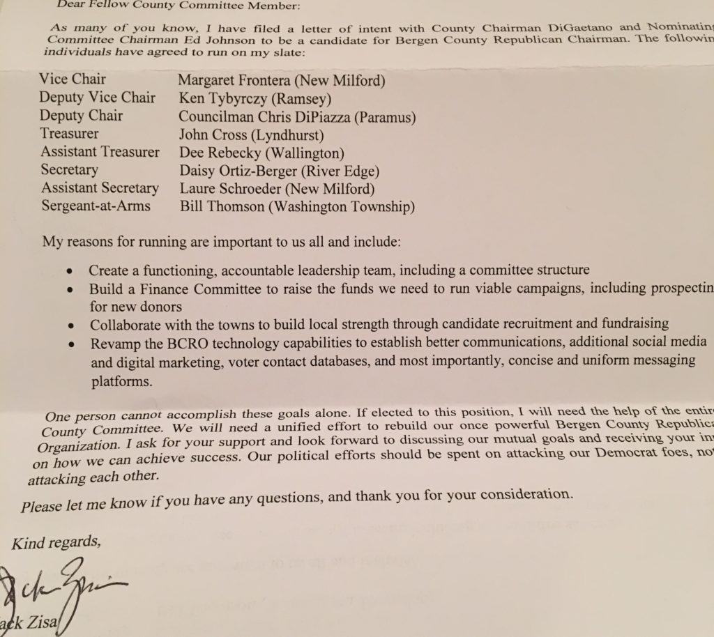 A letter penned by former Hackensack Mayor Jack Zisa today focused his campaign for Bergen County GOP Chairman with the following complement of slate mates: